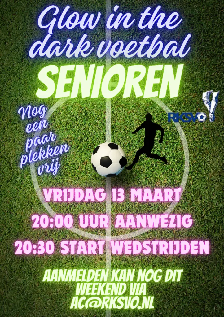 Glow in the dark voetbal “Senioren” voor leden RKSVO Vrijdag 13 maart a.s.20:00 uur aanwezig20:30 uur start wedstrijden Aanmelden kan nog dit weekend via ac@rksvo.nl