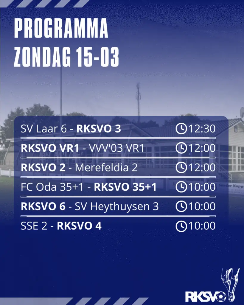 Zondag staat er weer een mooie voetbalzondag op het programma bij RKSVO! Met meerdere teams in actie en natuurlijk een thuiswedstrijd van het 1e op Sportpark De Houwakker.